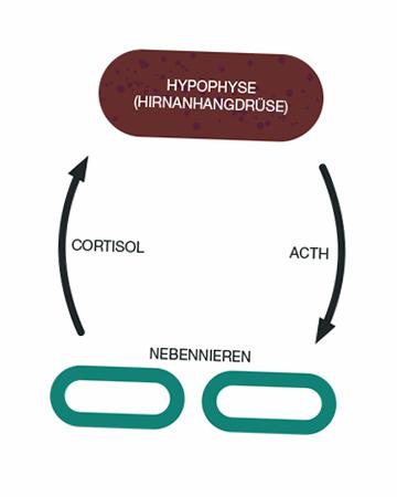 Die Produktion von Cortisol wird in den Nebennieren durch den Botenstoff ACTH aus der Hirnanhangdrüse (Hypophyse) angeregt.